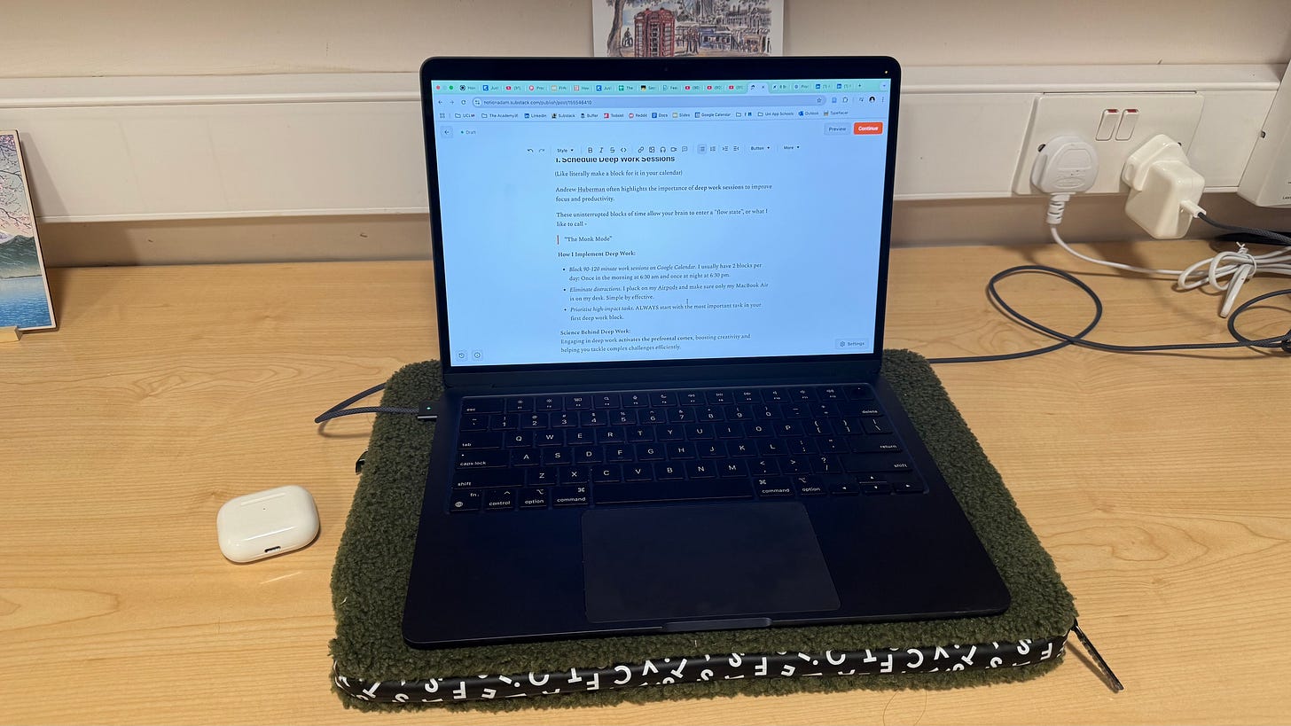 Eliminate distractions. I pluck on my AirPods and make sure only my MacBook Air is on my desk. Simple but effective.